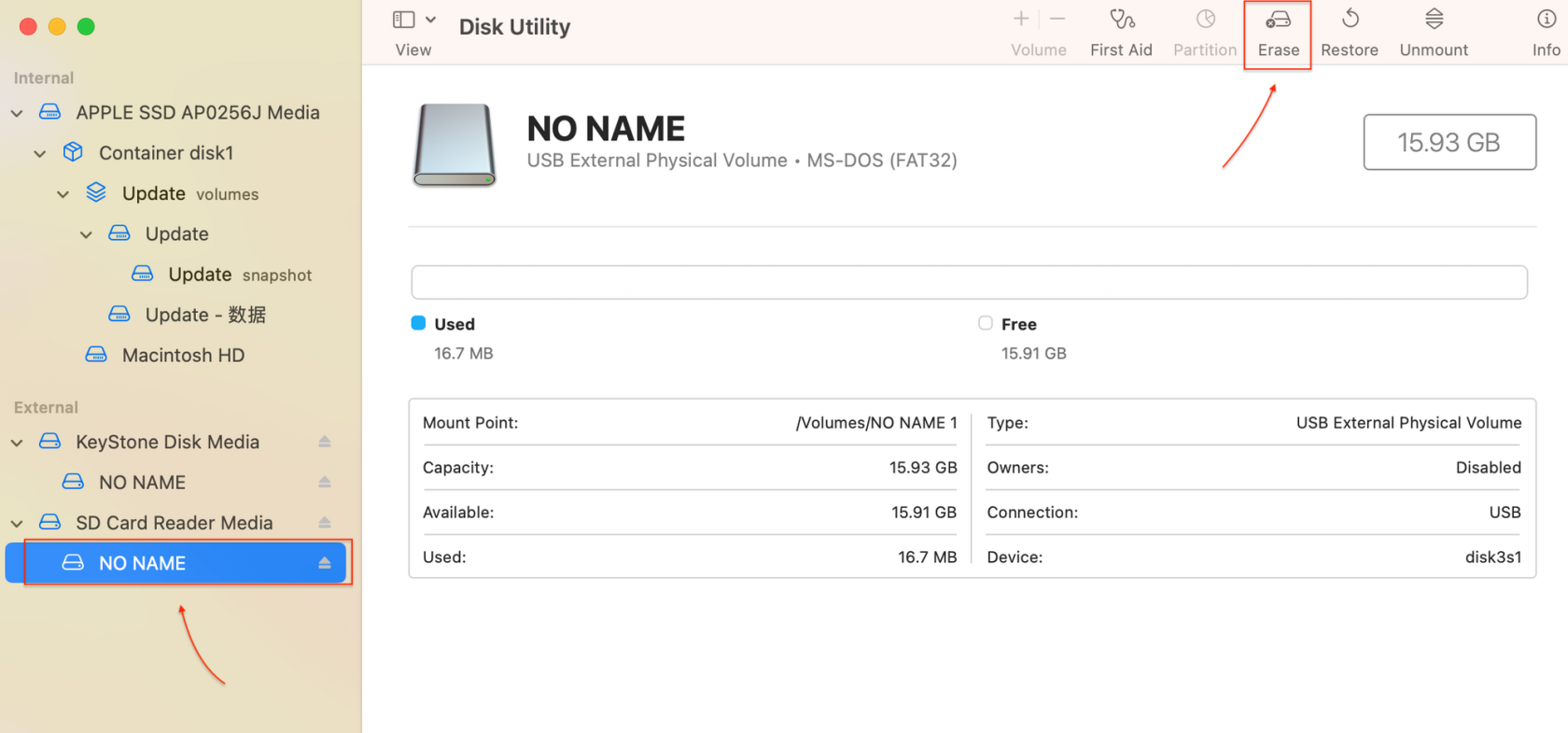 1. Вставьте карту MicroSD, откройте "Дисковую утилиту" через Spotlight.