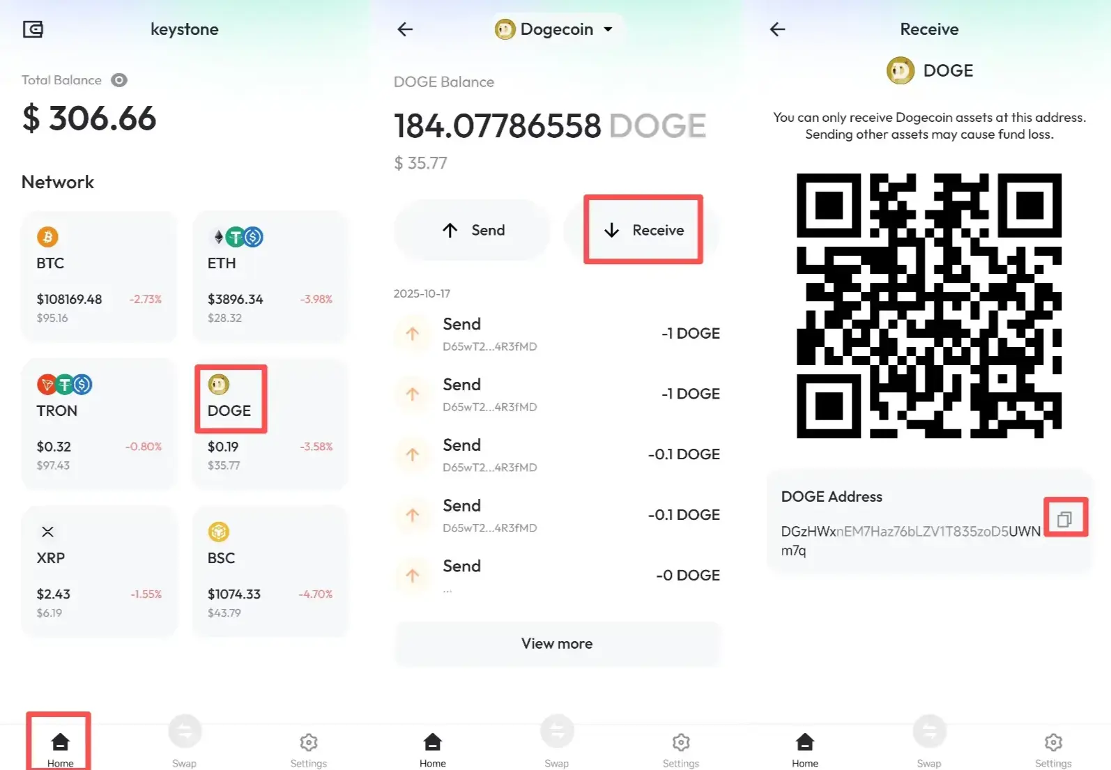 На главном экране выберите криптовалюту, которую хотите получить > нажмите [Получить]. Вы можете использовать QR-код адреса или нажать на значок рядом с адресом, чтобы его скопировать.