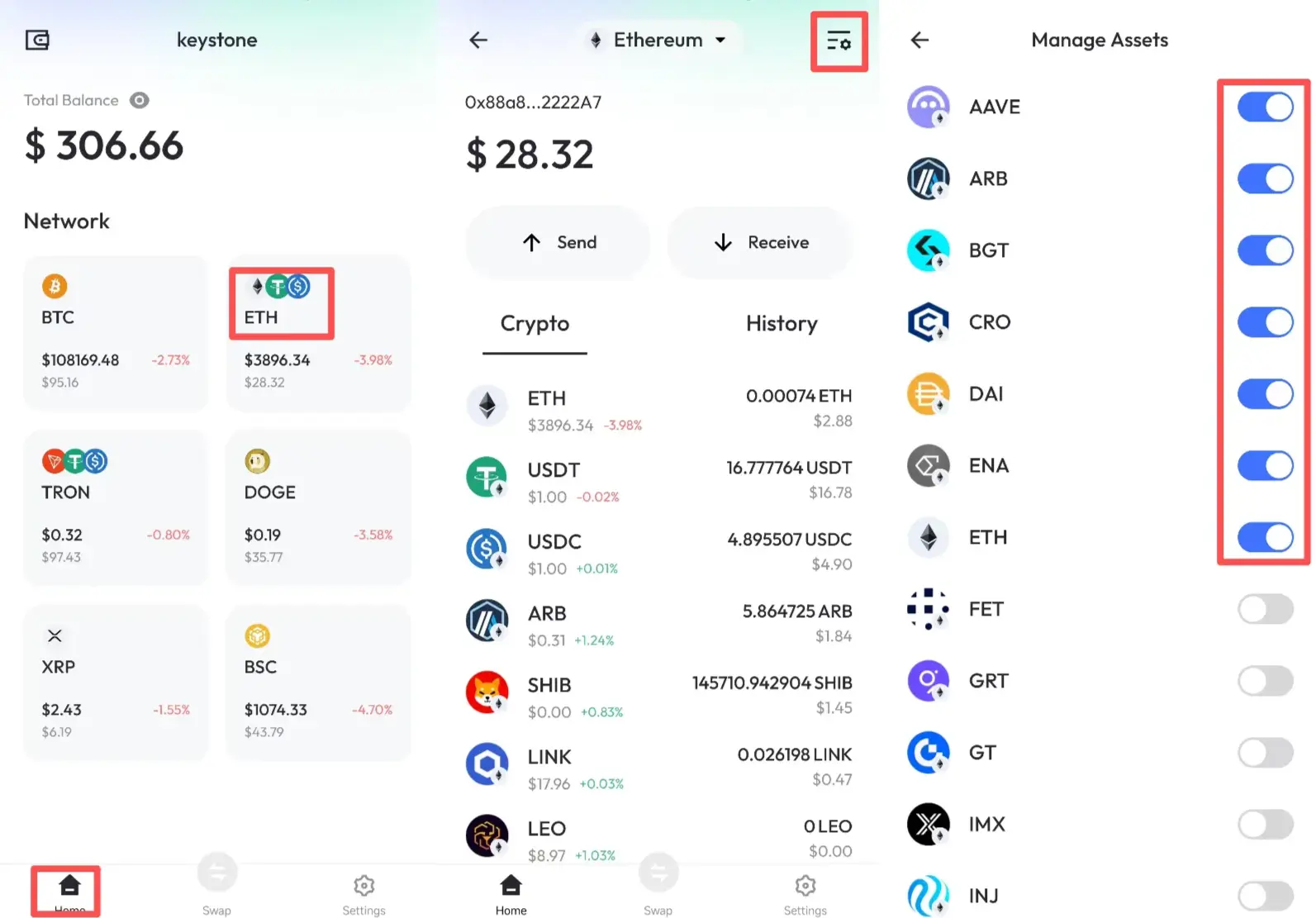 На главном экране выберите [ETH] > нажмите на значок в правом верхнем углу > отметьте токены, которые хотите отобразить.