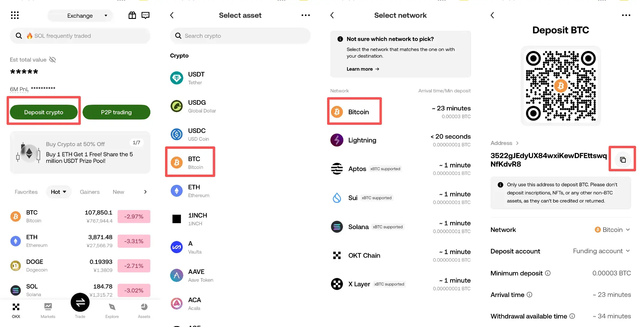 Перейдите в [Депозит] > выберите криптовалюту [BTC] > выберите сеть [Bitcoin] > используйте QR-код или скопируйте адрес для депозита.