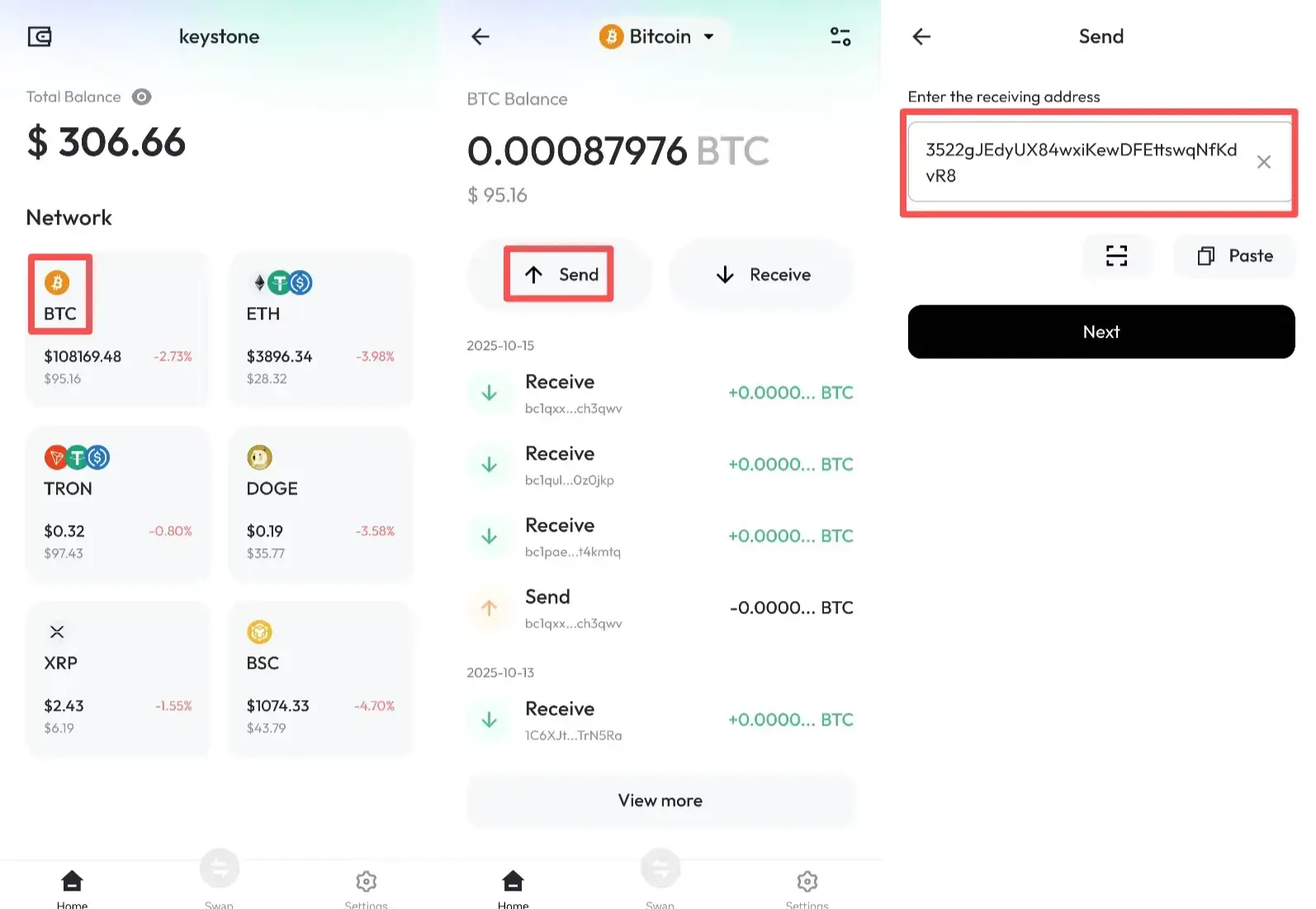 Перейдите в раздел Портфель > нажмите [Вывод] > выберите [Вывести криптовалюту] > далее [BTC] > [Биржи или кошельки] > выберите сеть [Bitcoin] > вставьте адрес получения, отображаемый в Keystone Nexus.