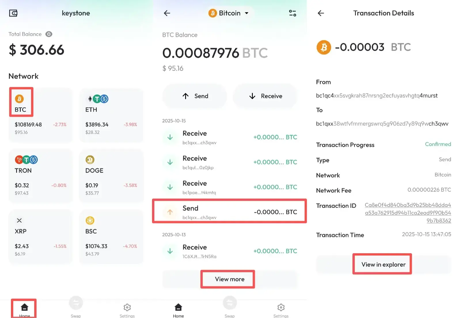 На главном экране выберите сеть, которую хотите посмотреть (например, BTC) > прокрутите вниз и нажмите [Показать больше], чтобы увидеть полную историю транзакций.