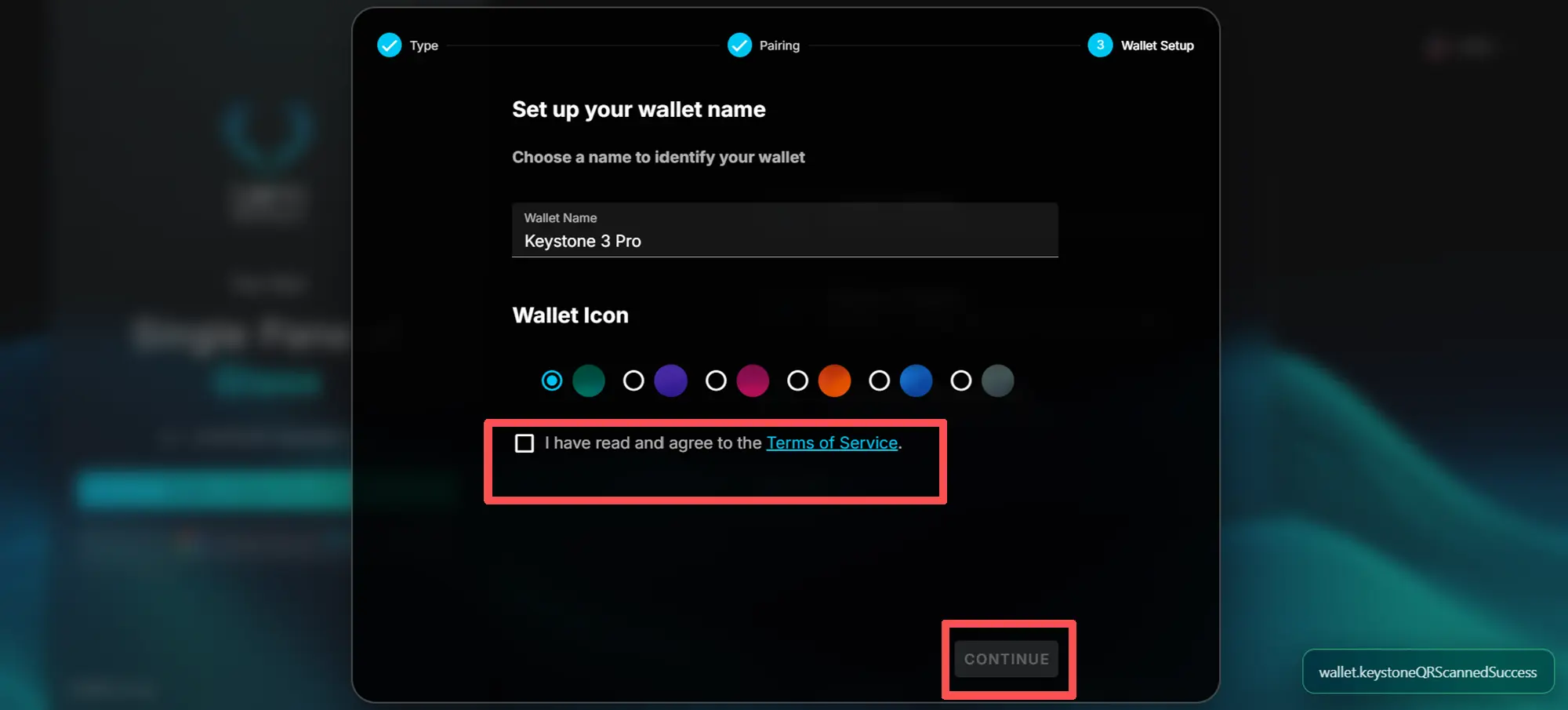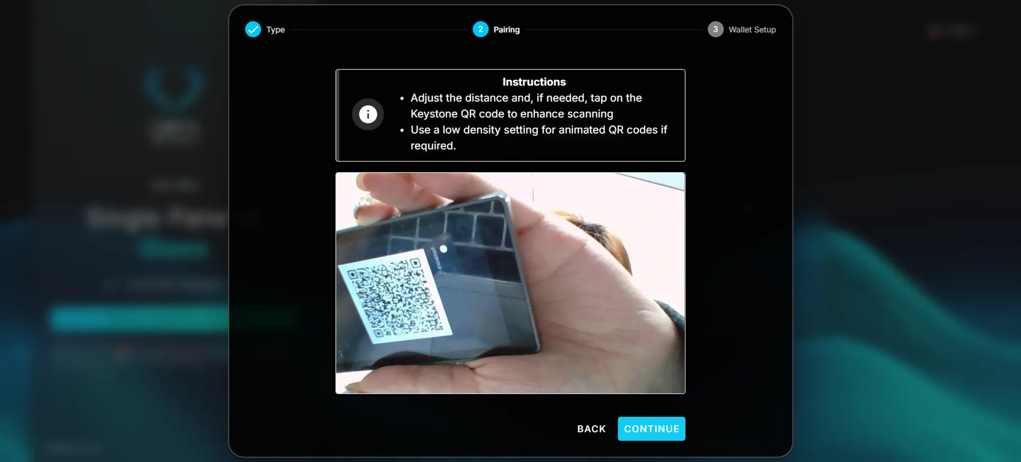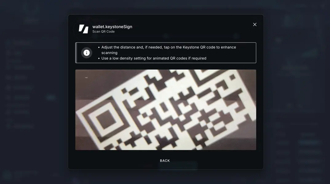 - В браузере: нажмите [CONTINUE] и используйте камеру вашего компьютера, чтобы отсканировать QR-код на устройстве Keystone.