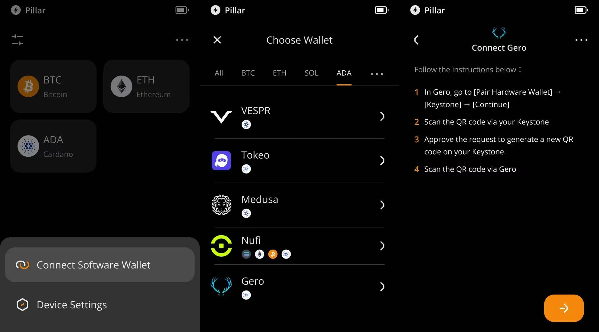 - На аппаратном кошельке Keystone: нажмите на значок [...] в правом верхнем углу главного экрана, нажмите [Программные кошельки], затем выберите [Gero].