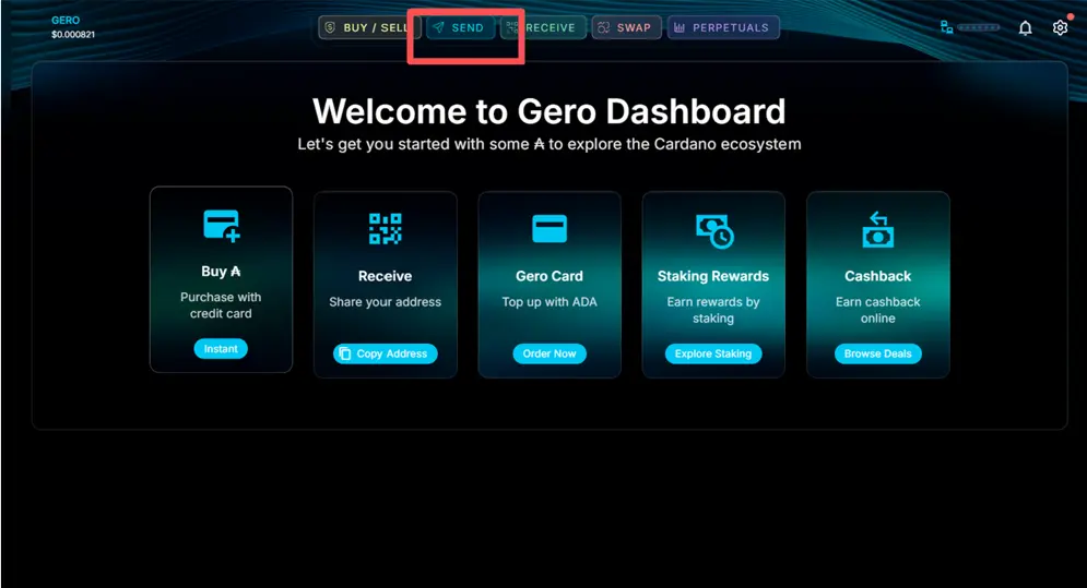 - На главной странице Gero найдите [SEND] и инициируйте транзакцию.
