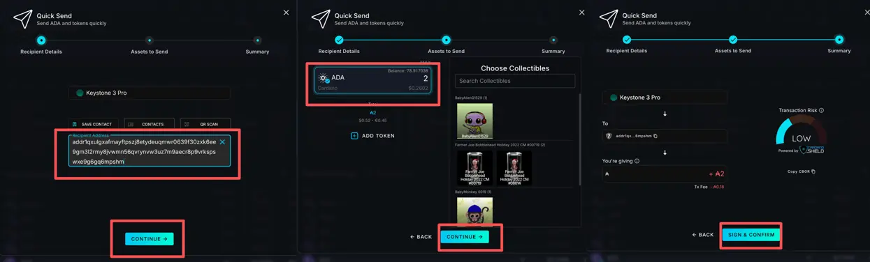 - Введите адрес получателя и сумму. На странице отобразятся детали транзакции. Нажмите [SIGN & CONFIRM].