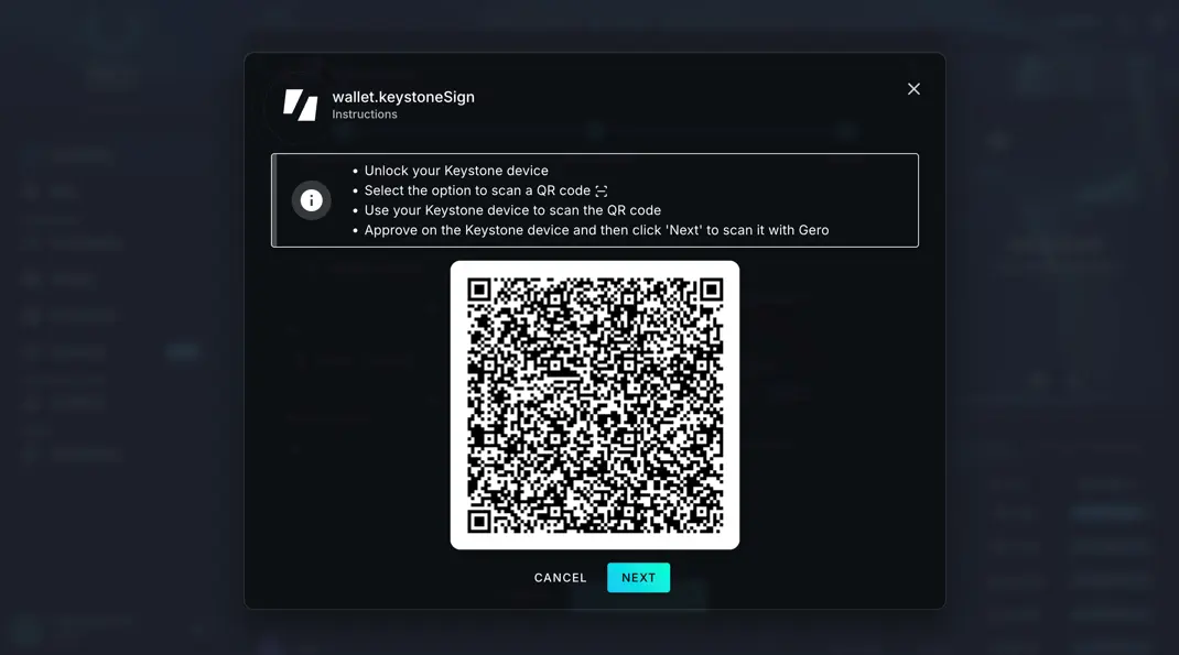 - В расширении Gero нажмите [NEXT] и отсканируйте QR-код с вашего устройства Keystone, чтобы отправить транзакцию.