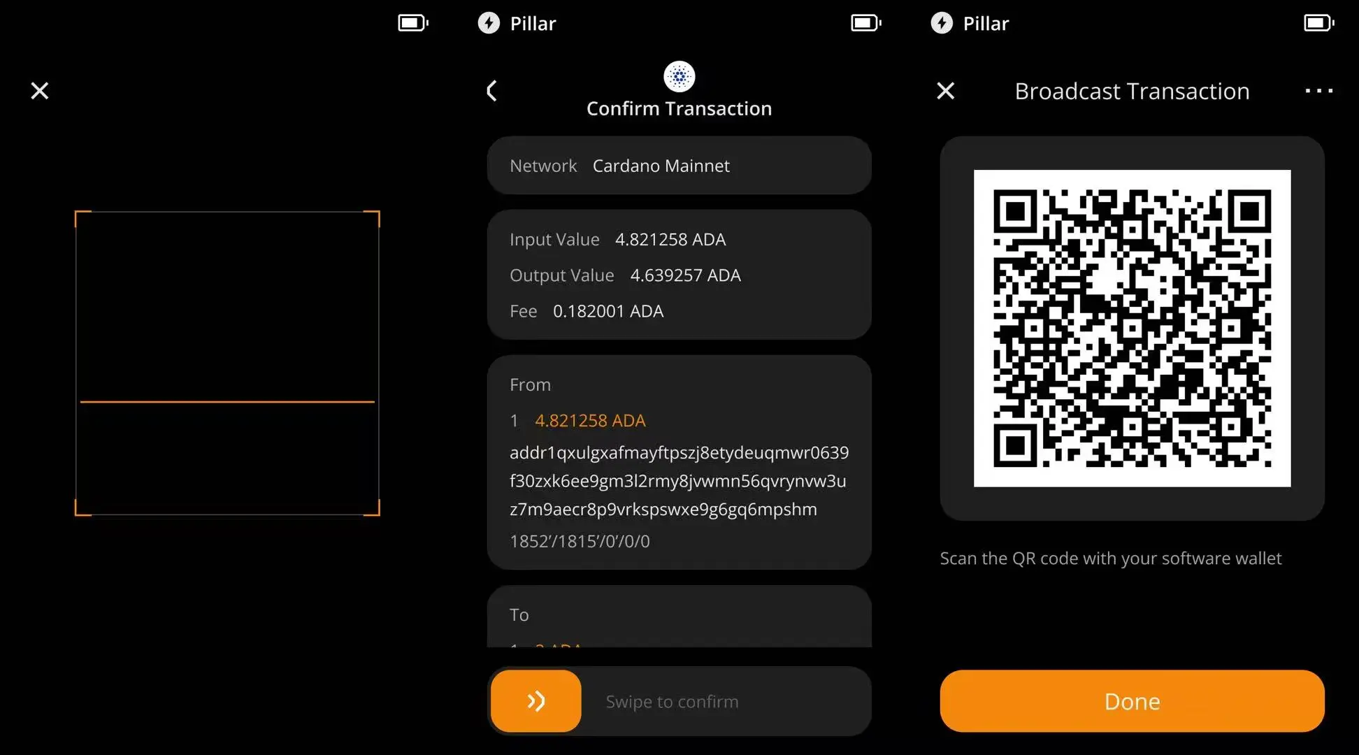 - После ввода пароля или использования отпечатка пальца будет сгенерирован QR-код с подписанной транзакцией.