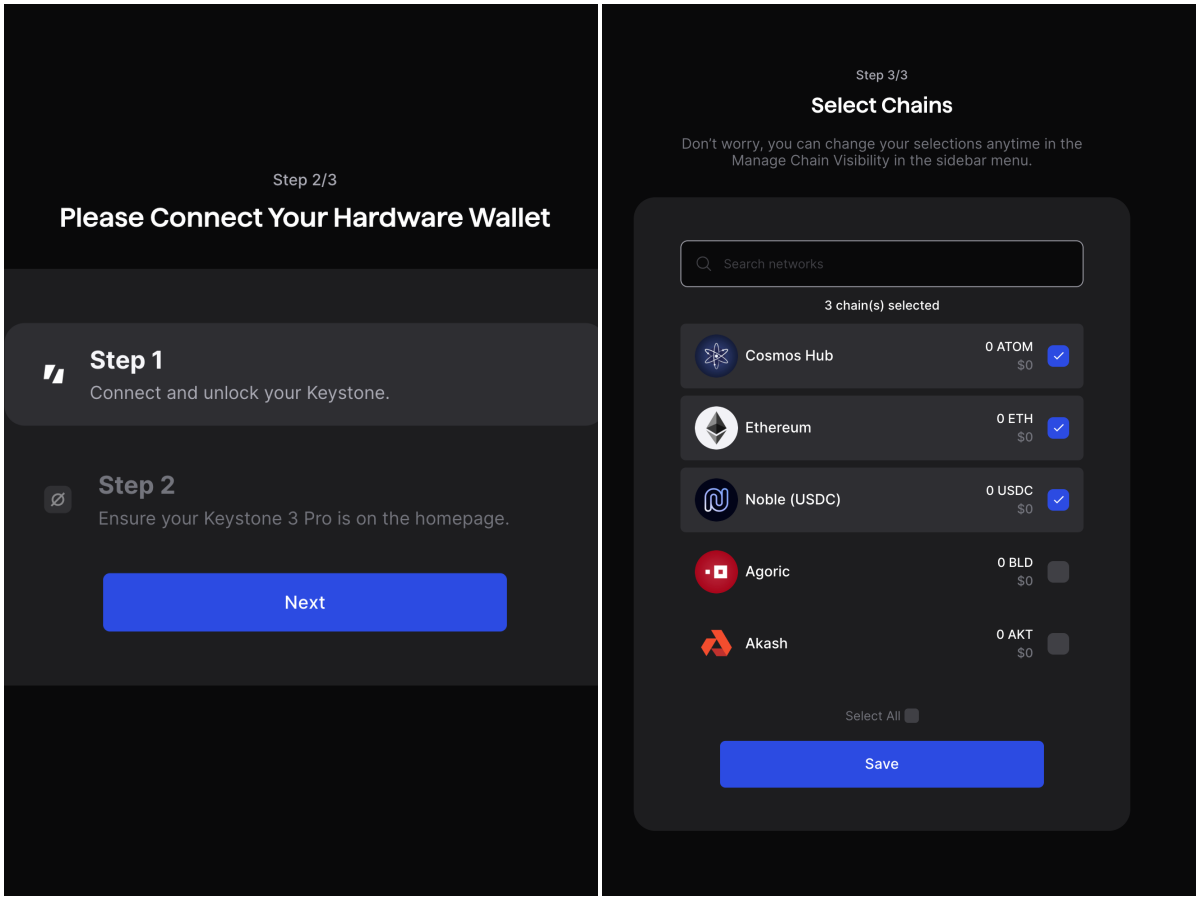 - Запустите расширение Keplr и выберите “Connect Hardware Wallet” и “Connect Keystone”.