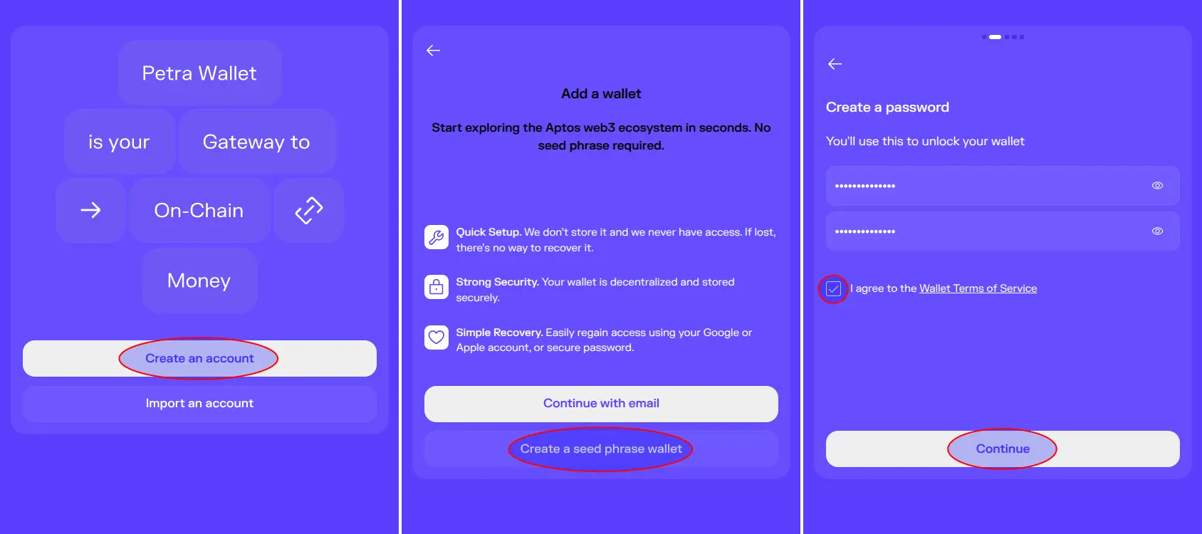 • Создайте пароль, отметьте чекбокс согласия с условиями обслуживания и нажмите [Continue].petra-desktop-1.webp