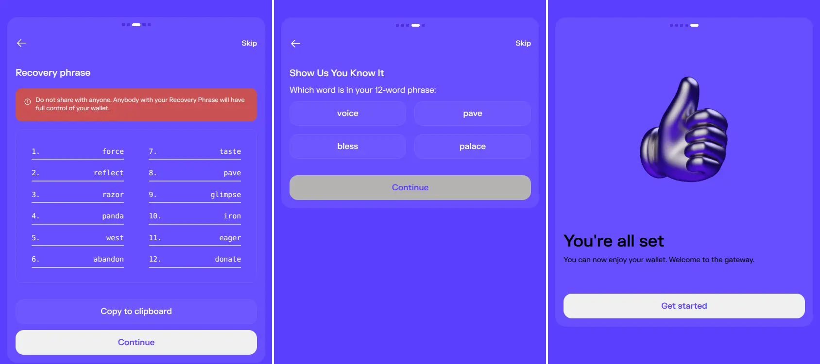• Выберите одно слово, которое есть в мнемонической фразе кошелька Petra, и нажмите [Continue].petra-desktop-2.webp