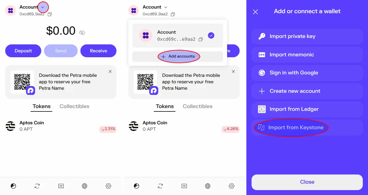 • Нажмите [+ Add accounts] и выберите [Import from Keystone].petra-desktop-3.webp