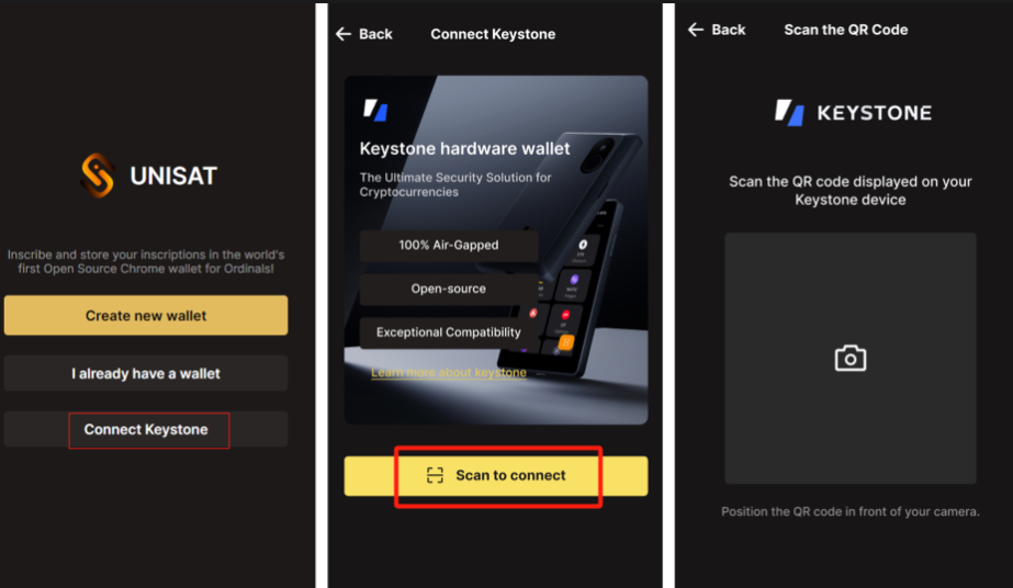 Keystone служит аппаратным кошельком для защиты ваших активов, и все транзакции после подключения требуют подписи через Keystone. Кроме того, вы можете исследовать и использовать разнообразные онлайн-функции UniSat для удовлетворения ваших базовых потребностей.