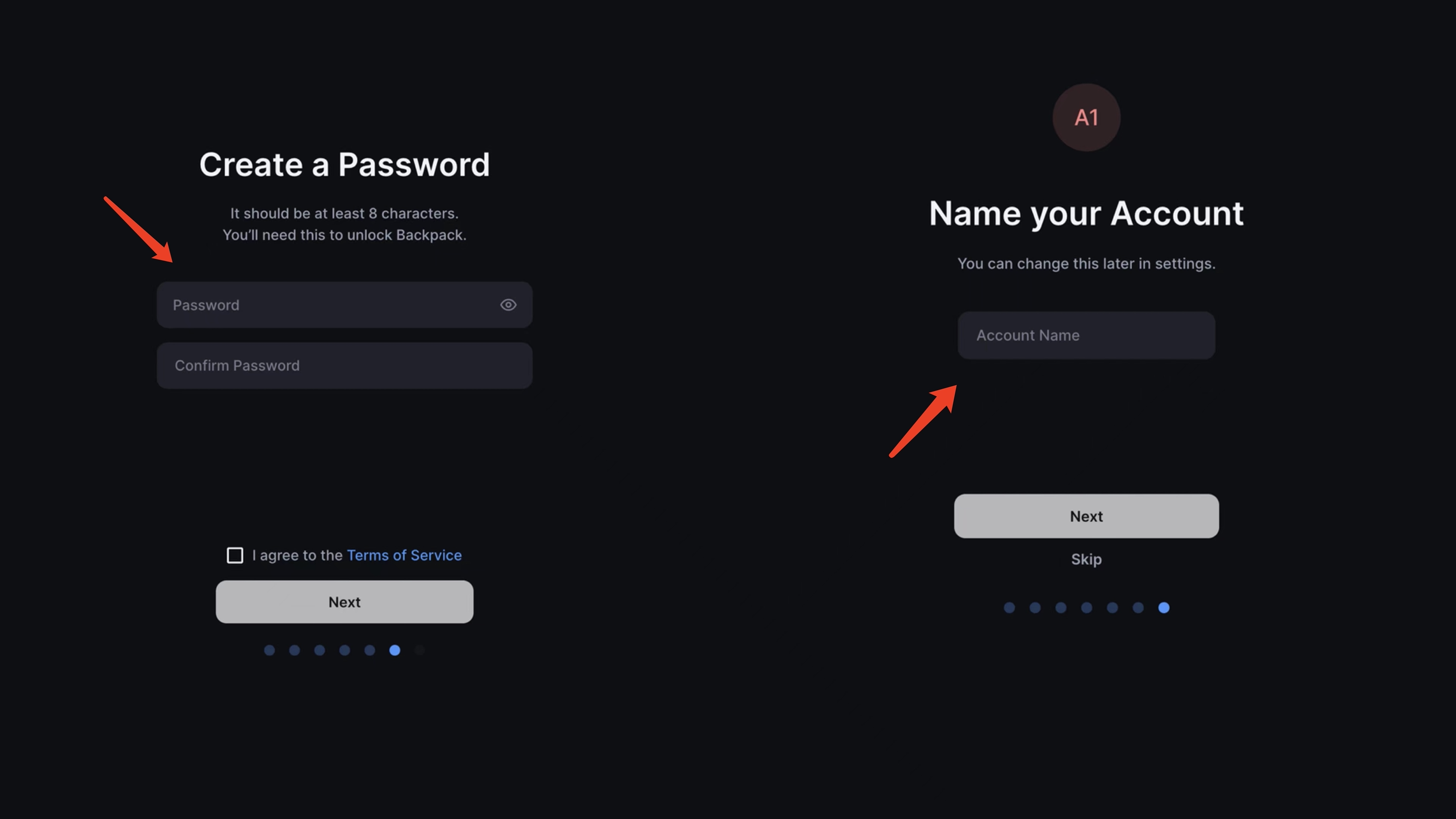 - Создайте пароль > Укажите имя для вашего аккаунта.