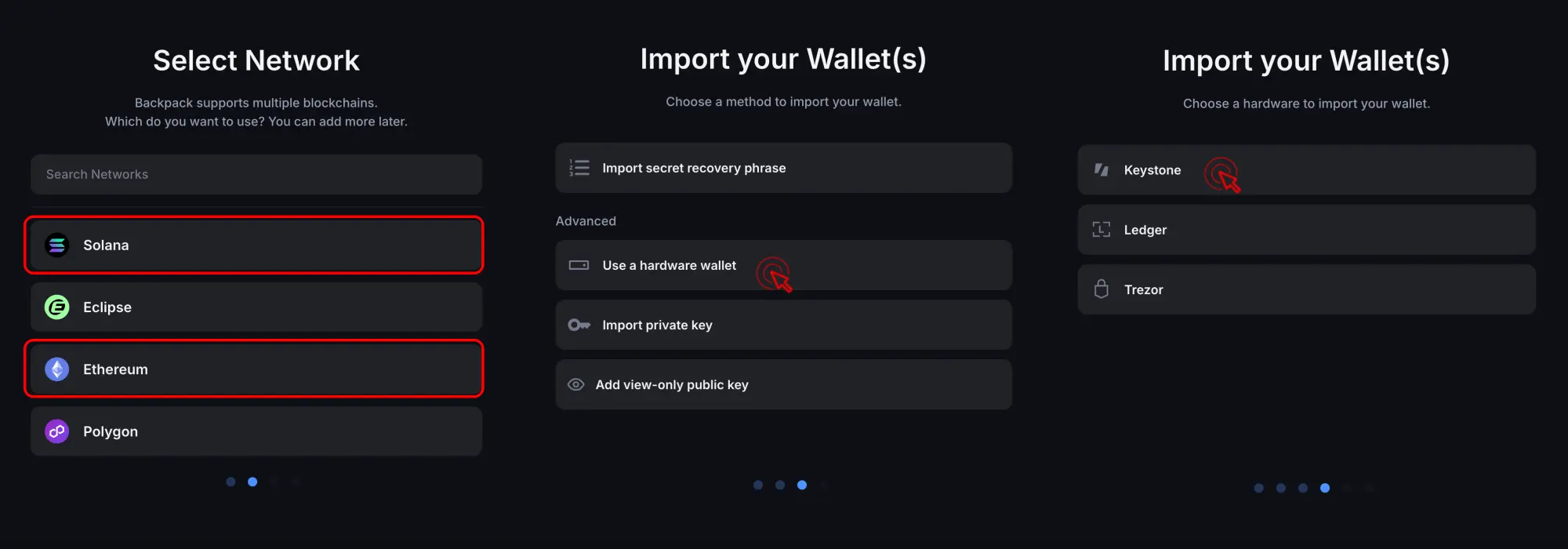 Добро пожаловать в руководство, которое проведёт вас через процесс подключения вашего аппаратного кошелька Keystone к расширению Backpack для управления активами в EVM-сетях, Solana и Sui.