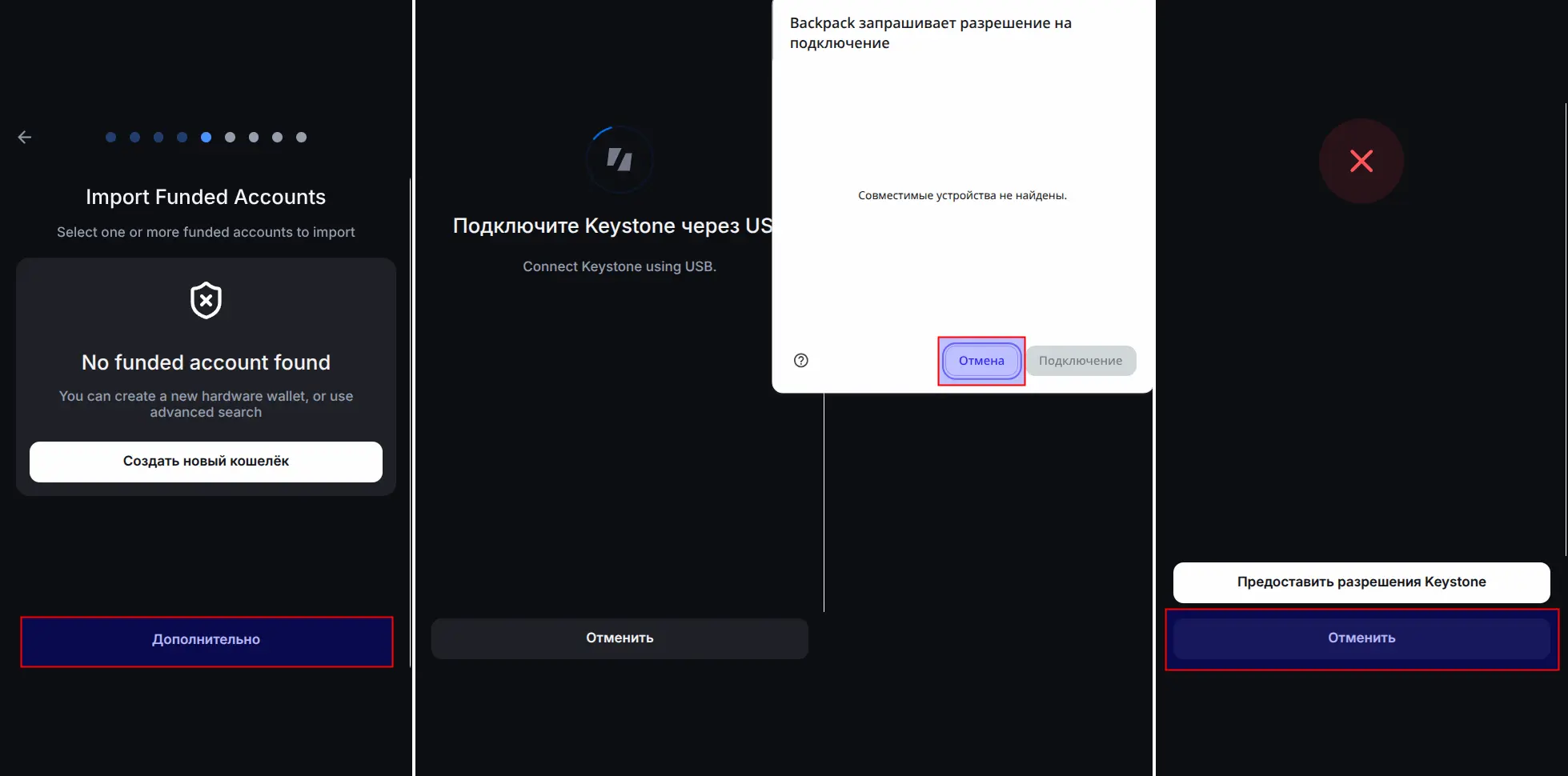 После завершения сканирования нажмите [Дополнительно] > В уведомлении браузера "Backpack запрашивает разрешение на подключение" выберите [Отмена] > В расширении Backpack нажмите кнопку [Отменить].