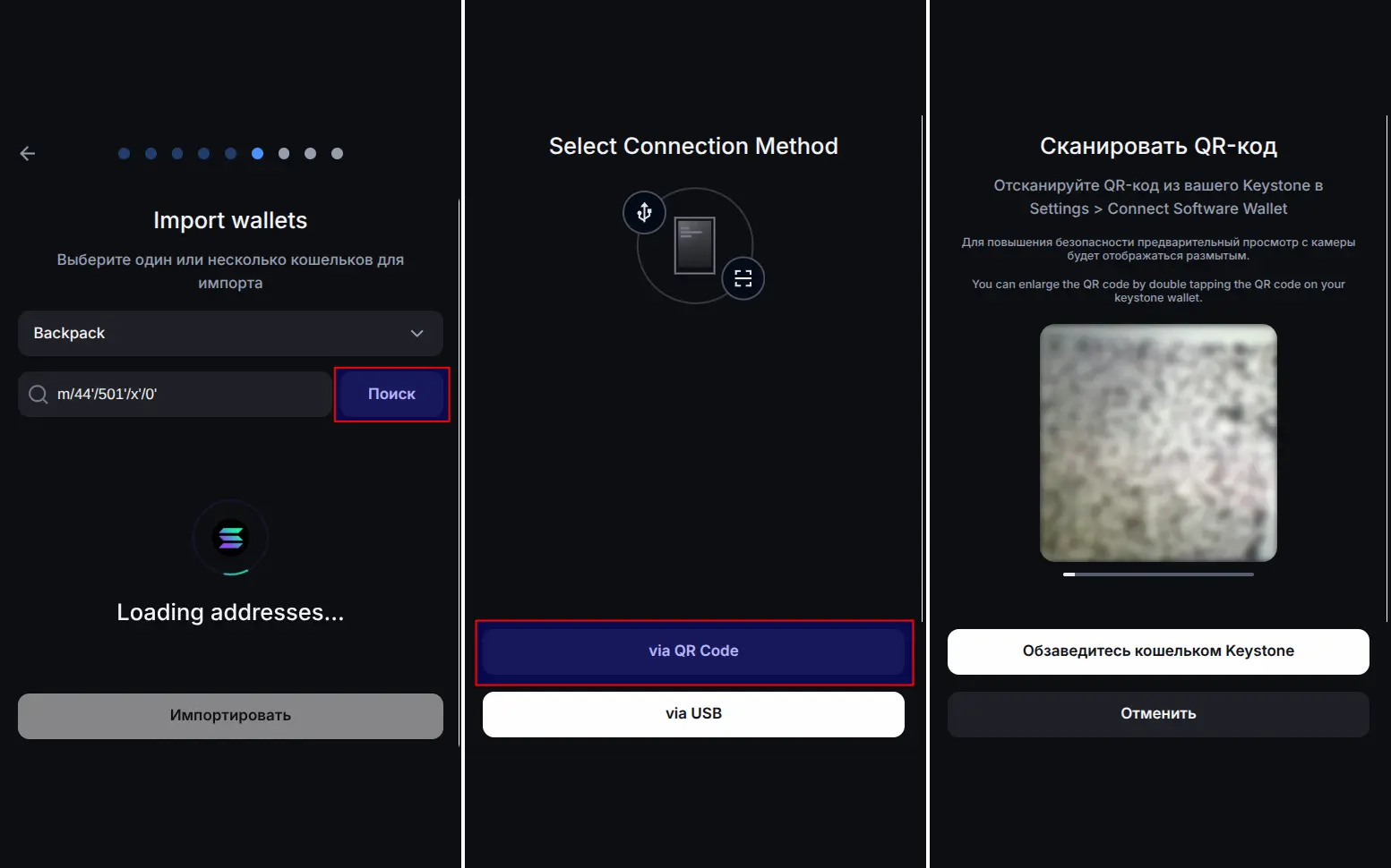 - На странице "Import wallets" выберите нужный путь деривации или оставьте значение "Backpack" по умолчанию > Нажмите кнопку [Поиск] > Выберите [via QR Code] > Вновь отсканируйте QR-код, отображаемый на экране Keystone.