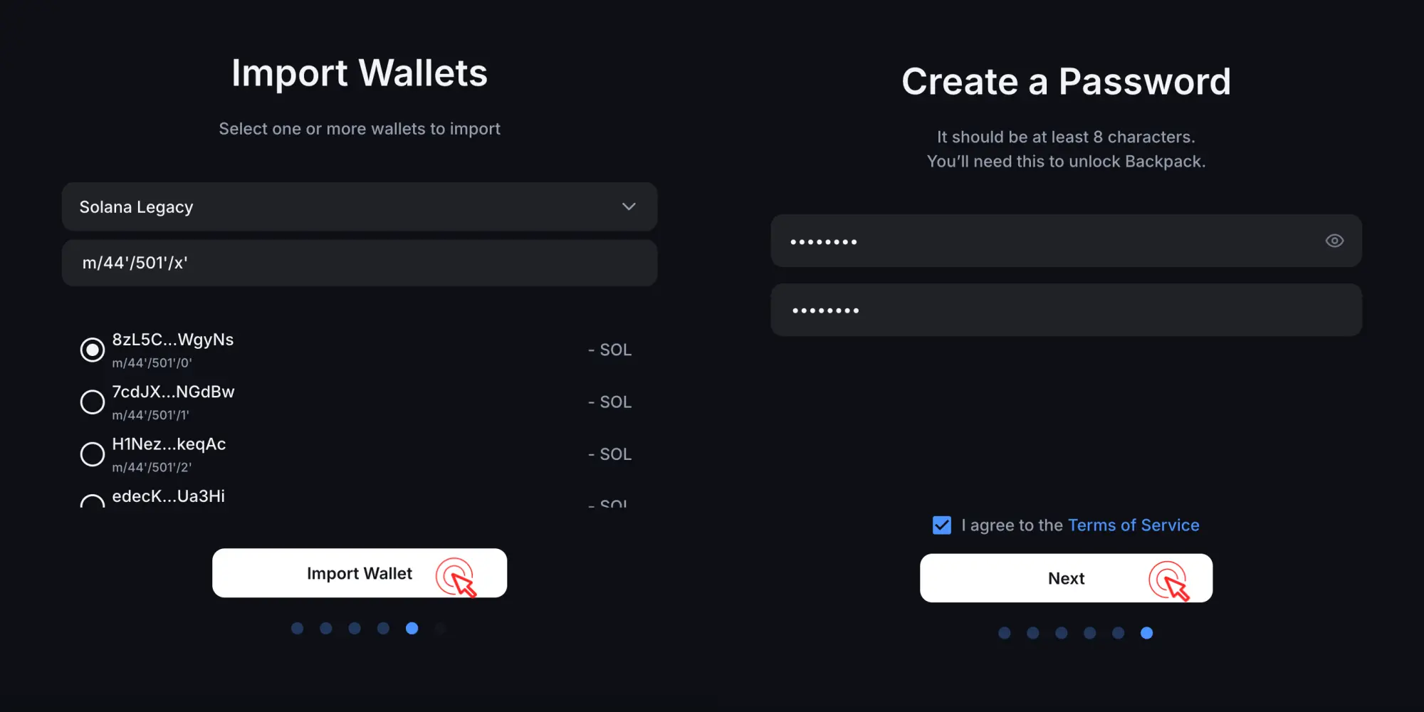 Выберите путь деривации и адреса, которые вы хотите импортировать > Нажмите [Импортировать] > Создайте пароль > Нажмите [Далее].