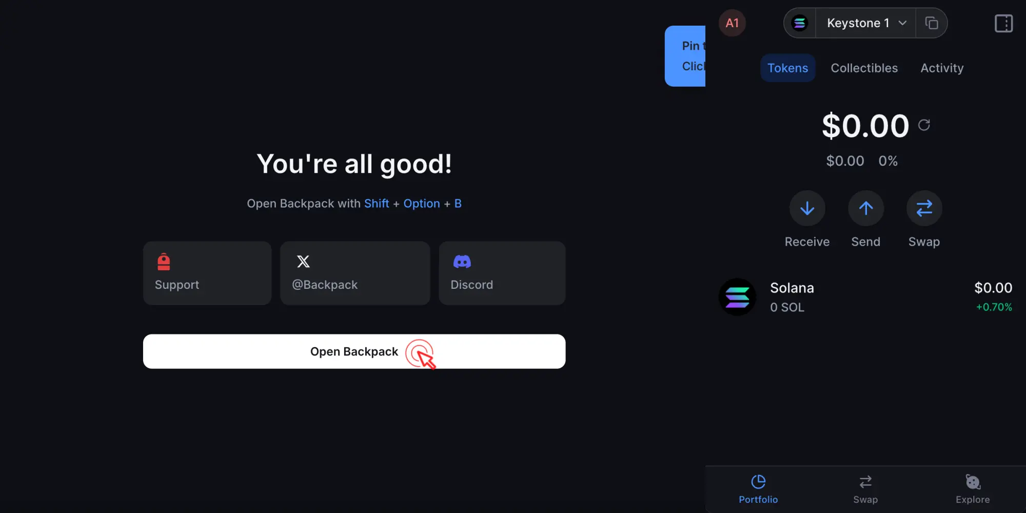 Нажмите [Открыть Backpack]. Вы успешно подключили Keystone к расширению Backpack!