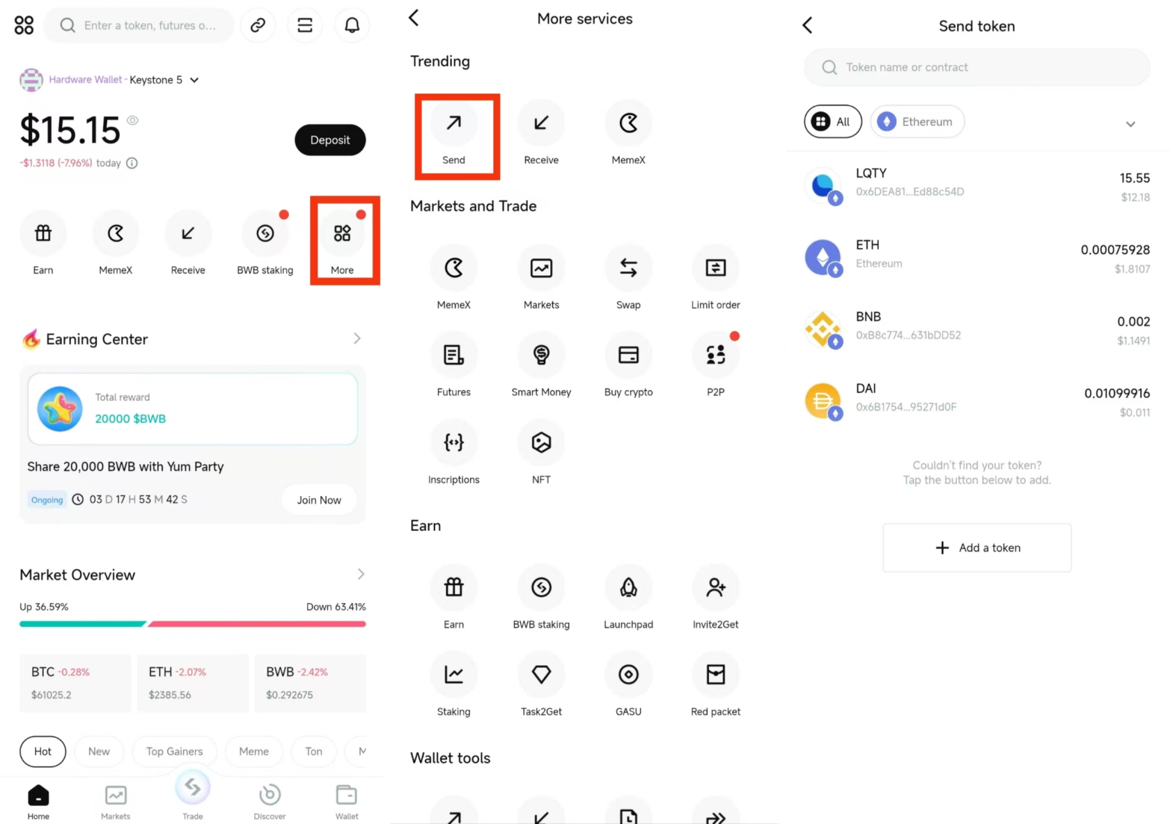 - Откройте главную страницу Bitget Wallet и нажмите More → Send.