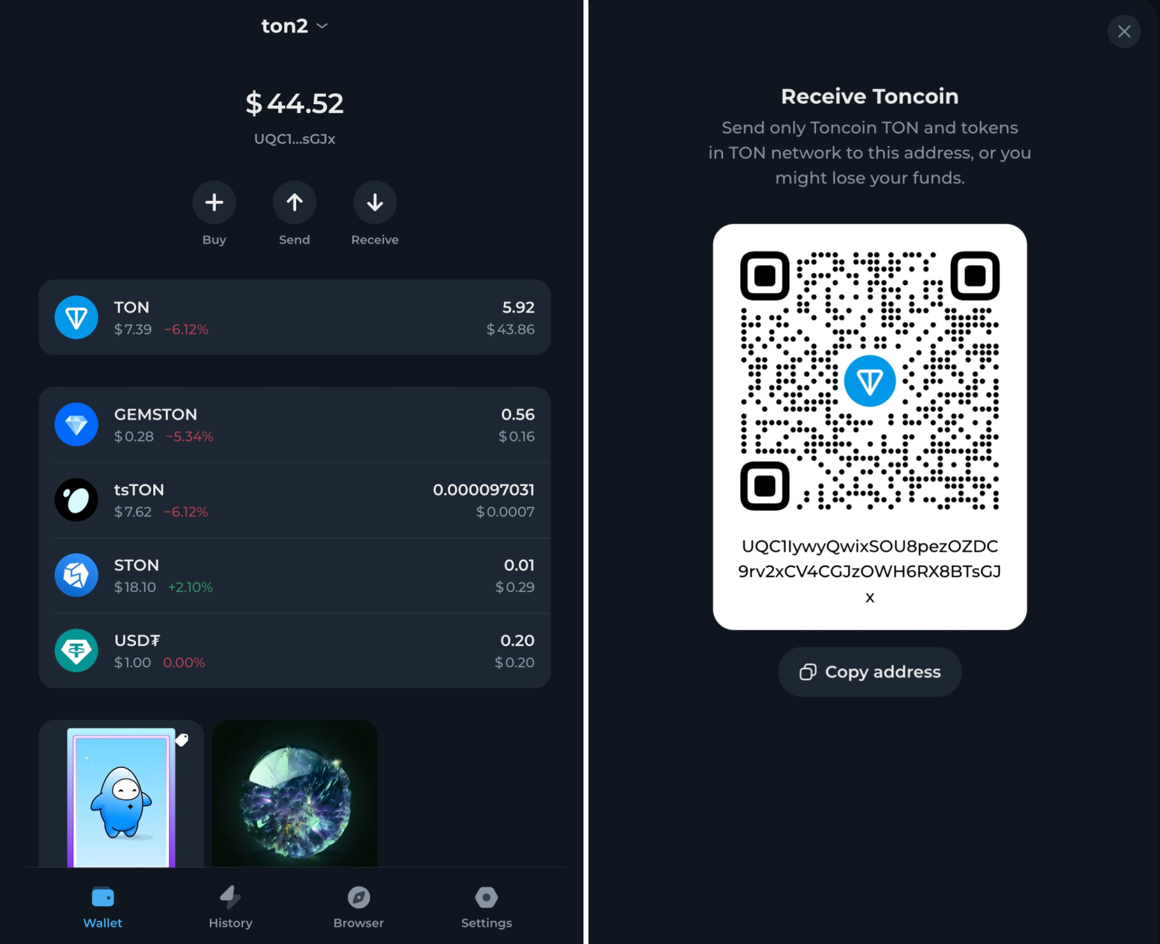 - В Tonkeeper нажмите кнопку “Получить” (для безопасности рекомендуется получать через аппаратный кошелёк Keystone или сравнить адрес).