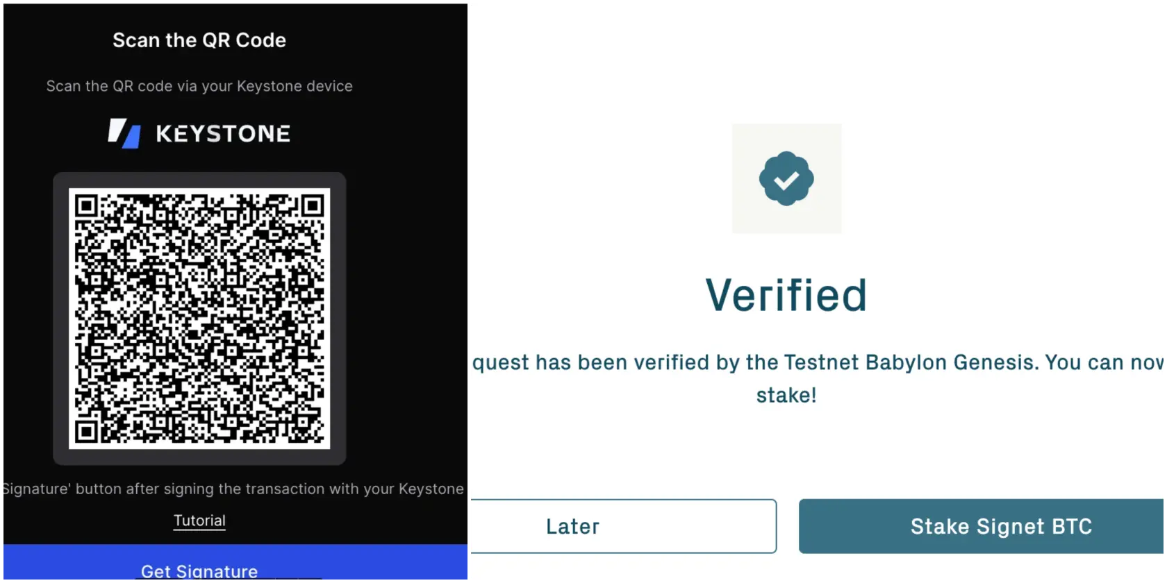 В расширении Keplr появится QR-код для подписания транзакции. Используйте ваш кошелек Keystone для сканирования и подтверждения транзакции. После появления сообщения “Verified” транзакция стейкинга будет завершена.