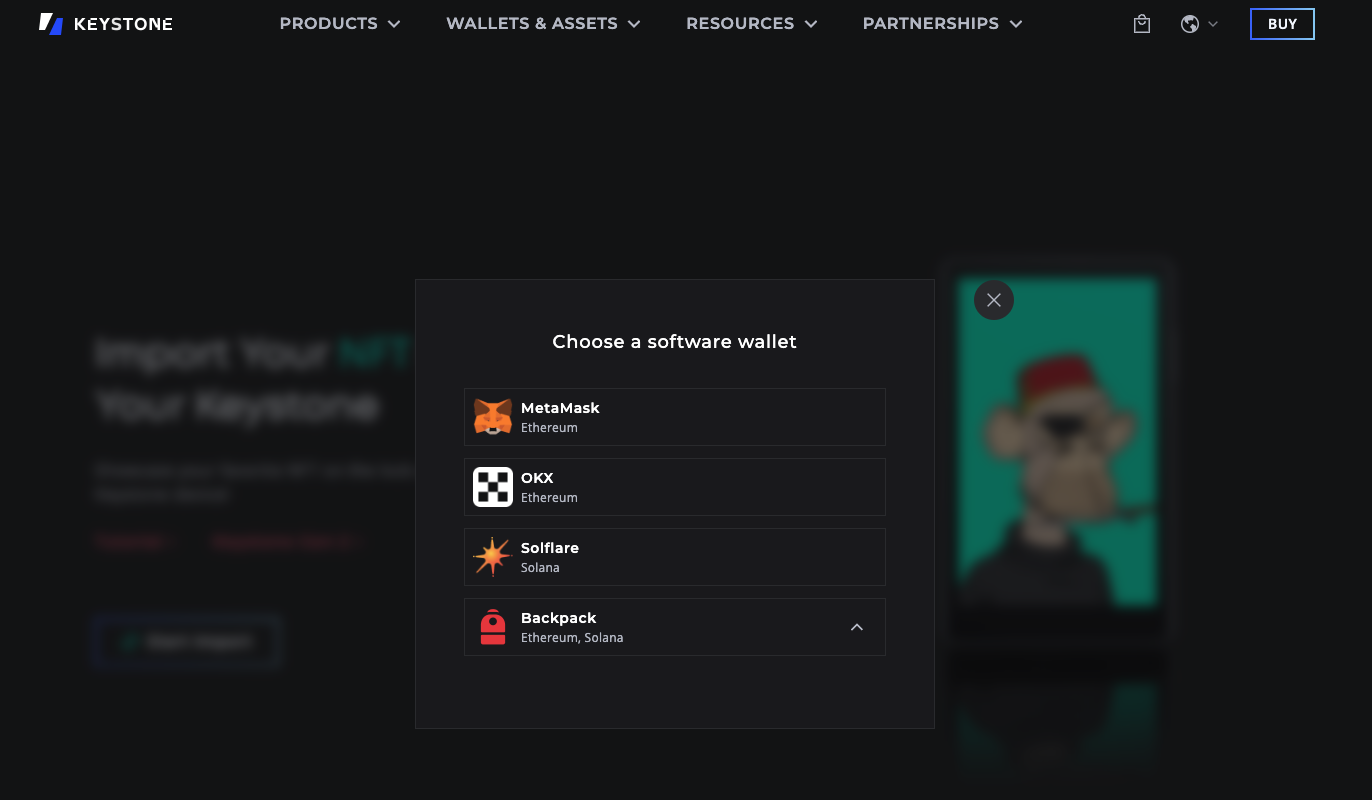 Легко импортируйте ваши NFT на Ethereum и Solana в Keystone с поддержкой MetaMask, Solflare, Backpack или OKX.